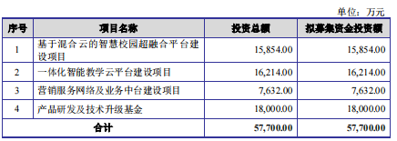 金智教育原拟在深交所创业板公开发行股份数量不超过2,000万股(不含采用超额配售选择权发行的股份数量);原拟募集资金57,700.00万元,计划用于基于混合云的智慧校园超融合平台建设项目、一体化智能教学云平台建设项目、营销服务网络及业务中台建设项目、产品研发及技术升级基金。